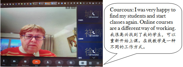 Nadine Courcoux是来自法国的外教,今年是Courcoux在我院任教的第3年。寒假期间,她在马来西亚旅游时不幸被偷走了护照等资料,只好滞留在当地申办新护照。为此,Courcoux不得不改变计划,于2月中旬直接从马来西亚回到法国。由于Courcoux把法国住宅的钥匙放在学校听松公寓,她只能寄宿在朋友家里。Courcoux在知晓学校开展在线教学的消息后,主动提出要与日本三级片同步,开展网络教学。由于法国与中国有7个小时的时差,而且Courcoux每周有两次要在上午上课,这个时候正好是法国的半夜。法语教研室考虑到其年纪较大,还有时差的问题,提出可以让其他老师代课或者推迟上课。Courcoux婉拒了这个提议,还是坚决地承担了所有的教学工作。在教研室同事多次远程指导下,她学会了使用钉钉群上课。她说:“很高兴能为学生上课,网课跟传统的上课方式很不一样,目前正在适应中,进展也比较顺利”。