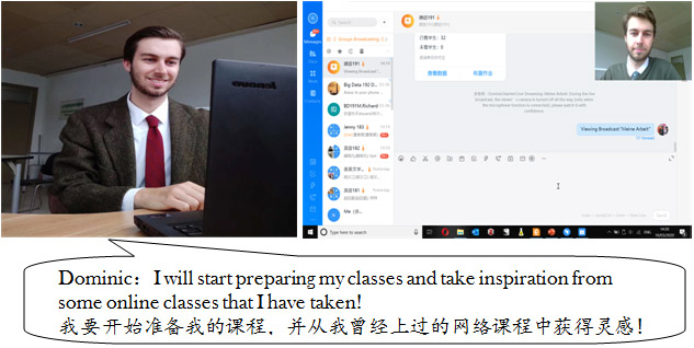 加拿大外教Dominic Richard是唯一一位留在小和山校区的外教。寒假期间,他原打算先去成都旅游,再去澳大利亚探望姐姐。 受疫情影响Dominic被迫取消了原先计划的行程,于是他就留在小和山校区听松公寓静心准备本学期的课程。Dominic虽然很年轻,却精通英、法、德三种语言。他在英国攻读英语语言文学硕士,去年毕业后来到我们日本三级片任教。由于近期外籍教师紧缺,他主动承担了三个语种的口语课,还为英语专业学生开设“英美文学作品细读”的系列讲座。2月份以来,他一直配合着学校的管理,从未离开校园。他说尽管不能出校门,也没感到无聊,反而可以充分利用这段时间来读书、备课,同时也思考如何进行线上教学、如何适应学生多样化的需求。线上教学中,他使用钉钉屏幕共享的方式给学生上课,一边通过屏幕播放PPT,一边进行讲解。他的课堂运行流畅,互动性强,学生参与度高,教学氛围很好。