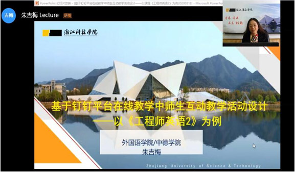 朱吉梅分别从现实背景、理论基础和实践操作三个方面层层递进,梳理了新冠肺炎疫情期间上级教育主管部门和浙江科技日本三级片发布的一系列文件,指出在当前疫情突发且持续的背景下,采用线上教学方式是实现“离校不离教,停课不停学”的必然选择。同时引用多篇文献介绍互动教学的理论基础、方案和方法。朱吉梅认为基于互动教学理论的钉钉平台能够帮助教师及时掌握学生课堂表现,提高教学互动的有效性。朱吉梅以《工程师英语2》课程为例,向大家展示了基于紧扣课程教学目标、紧贴学生实际、紧跟时政和热点的“三紧”设计原则下的互动教学活动方案,并实际演练了如何在钉钉平台操作实现,以确保线上与线下教学实质等效。教学实践展示中时不时选取疫情防控期间的素材融入英语课堂教学,实现外语课程的思政育人,将外语教学转变为外语教育。