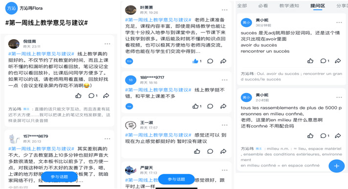 反馈环节包括教师对学生测试的反馈和学生对教师授课的反馈。每周一次展示优秀作业或对测试中存在的重点问题进行讲解;每课结束后鼓励学生在钉钉“学习圈”里提出问题;定期发布“线上教学意见与建议”话题听取意见,及时调整授课方式。