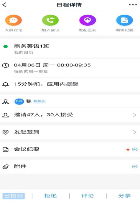 本课程采用课堂签到的形式为:日历签到。开课前设定好重复日历,可提前(如15分钟)提醒学生上课并通过教师分享的日程签到二维码进行签到。