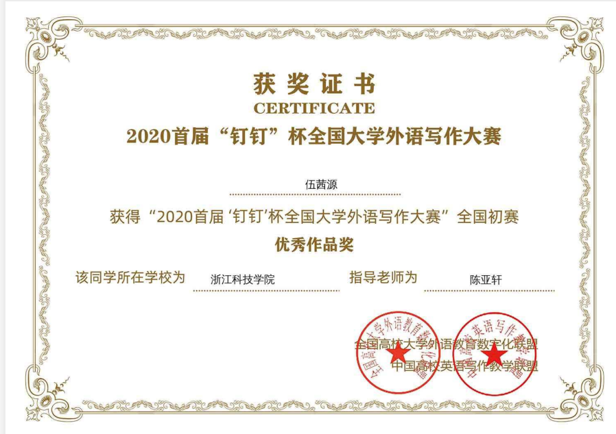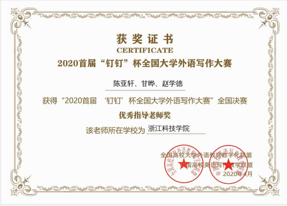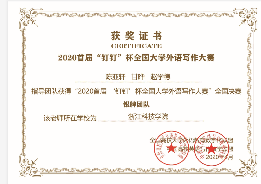2020 年首届“钉钉”杯全国大学外语写作大赛(以下简称大赛)是由全国高校大学外语教育数字化联盟、中国高校英语写作教学联盟联合主办,全国高等学校大学外语教学研究会指导,钉钉(中国)信息技术有限公司平台支持,批改网(www.pigai.org)、西安嵩硕教育科技有限公司共同承办的覆盖全国在校大学生的线上外语写作比赛活动。2020年1月15日至2020年3月31日在钉钉平台进行了大赛初赛,浙江科技日本三级片由574名学生组成的团队报名在全国近30万人、600个高校、近3000个团队中表现突出,顺利获得入围决赛资格。