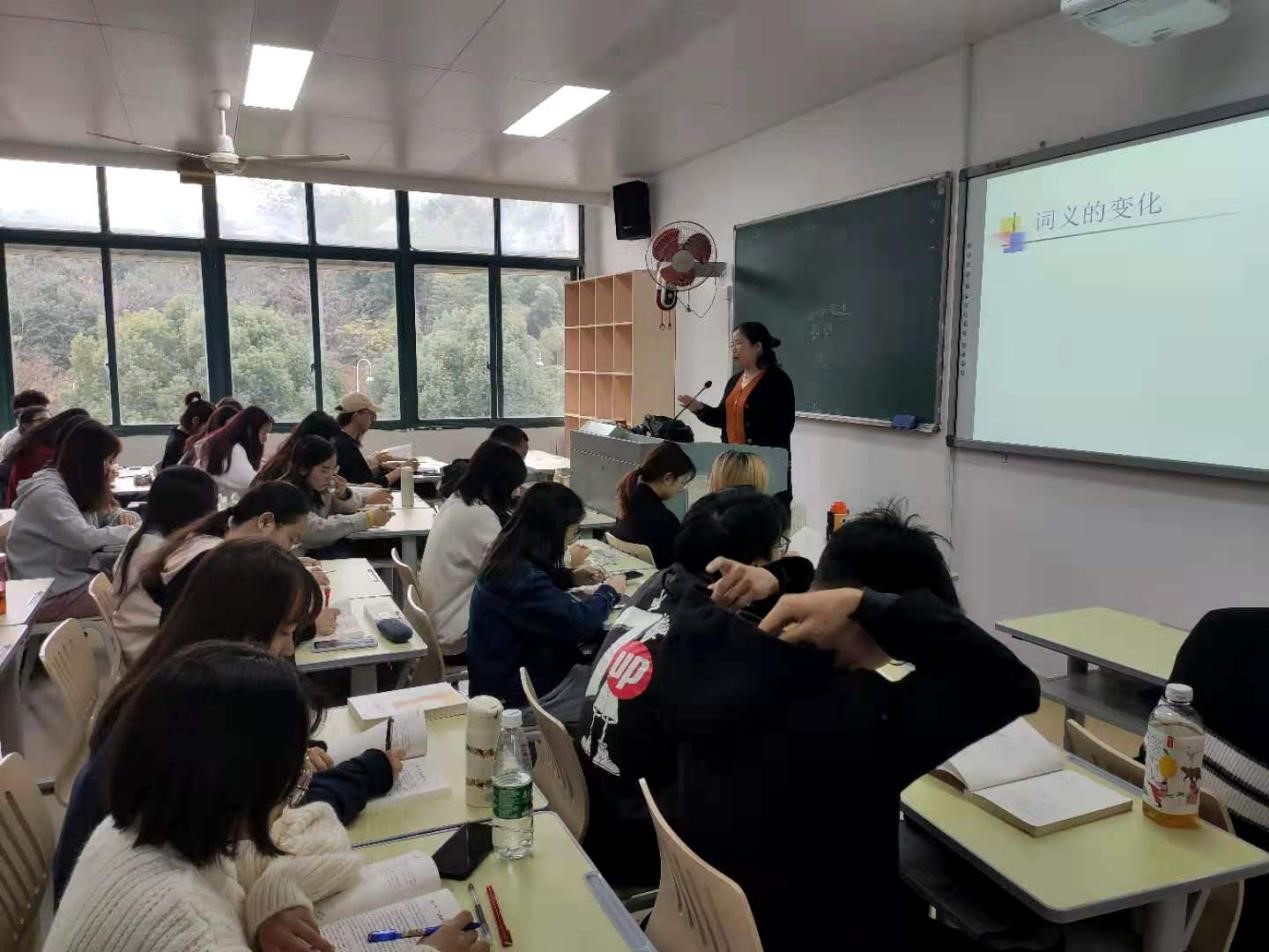 为严格把关精品在线开放课程建设项目验收,同时进一步提升课堂教学质量,积极倡导创新型教学,充分发挥优秀教师在教学中的引领示范作用,近日我院组织院教学督导组通过督导听课、材料审核等方式对方小卿、黄晶晶、黄扬三位老师主持的精品在线开放课程建设项目进行了结题验收。同时,为广大教师提供一个互相学习、共同提高的平台,组织面向全院的课堂教学观摩活动。全体外语教师观摩了分别于11月19日和11月20日由黄晶晶老师主讲的《国际交流英语》和黄扬老师主讲的《德语语言学导论》示范课。本次观摩活动由教学副院长王旭莲主持。