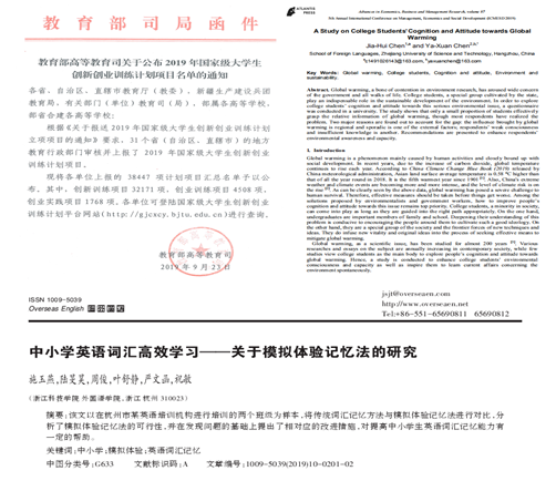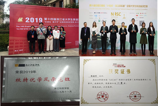 英语系重视学生学科竞赛和科技创新活动。2019年英语系学生获批国家级大学生创新创业项目2项:“‘入选2018年浙江民营企业家100强’的杭州企业家特质研究”和“面向在杭高校留学生校园生活服务的双语微信公众号研发”;省新苗人才项目1项:“大运河(杭州段)五杭集镇文化遗产现状调查分析”;校春萌计划多项。另有3项国创项目、1项省新苗项目、19项春萌项目顺利结题。同时,积极引导学生对学术研究的兴趣,培养学生的学术能力。英语系5名学生在老师的指导下在学术期刊上发表论文,其中1篇为国际学术会议论文。
