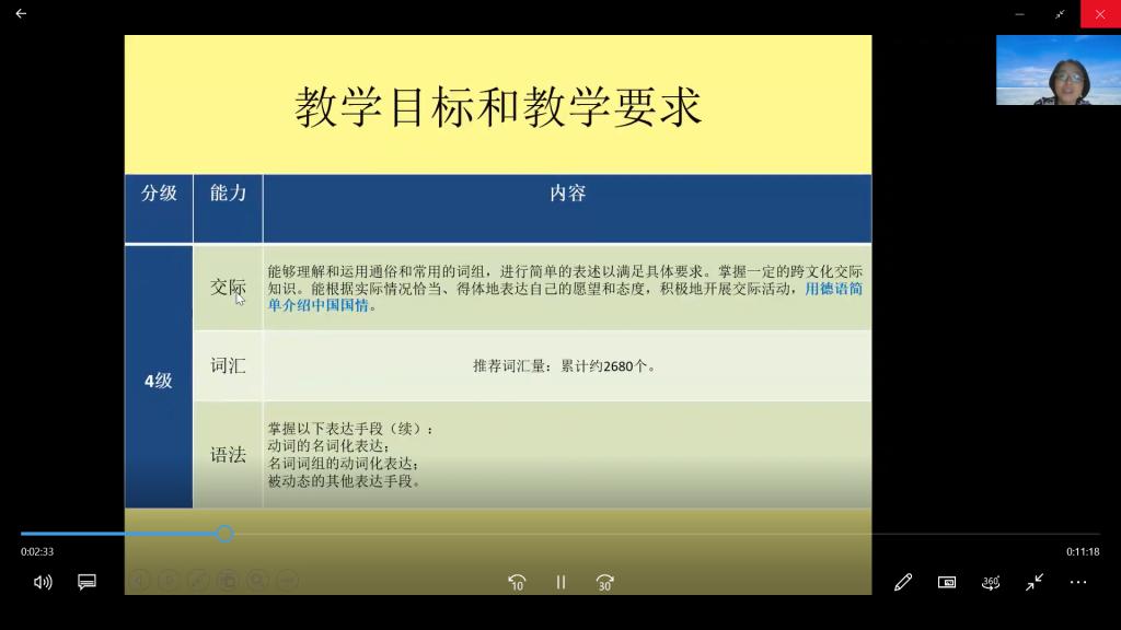 根据2021年版《大学德语教学指南》的要求和2022年新修订的《大学德语四、六级考试大纲》的具体内容,讲座对大学德语四级考试样题各大板块(听力理解、阅读理解、语法词汇、写作)进行题型、题材、题量和评分标准等方面的解读和介绍。