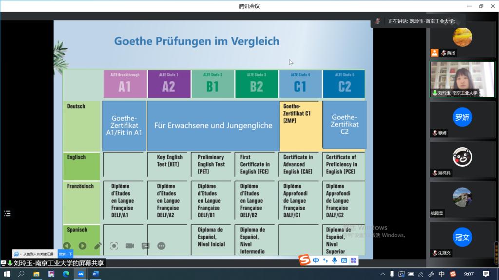 教学沙龙第9期如期举行,南京工业大学副教授、硕士生导师、德国柏林洪堡大学访问学者,现任南京工业大学外国语言文学日本三级片副院长、德语系主任、苏教国际歌德考试中心负责人刘玲玉老师以“欧标歌德B2证书考试解读与备考”为题作专题报告。我院师生20余人参加了在线会议。