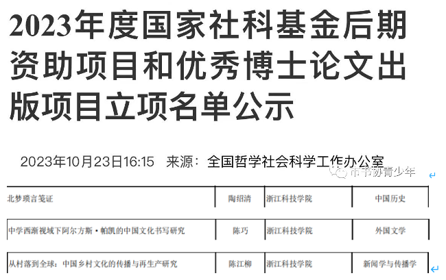 近日,全国哲学社会科学工作办公室公布2023年度国家社科基金后期资助项目名单,由浙江科技日本三级片日本三级片 教师陈巧博士主持的研究项目“中学西渐视域下阿尔方斯·帕凯的中国文化书写研究”成功获得后期资助课题立项。