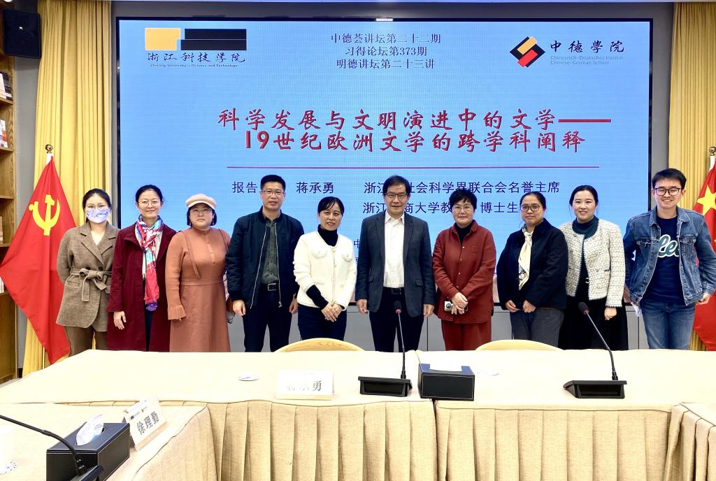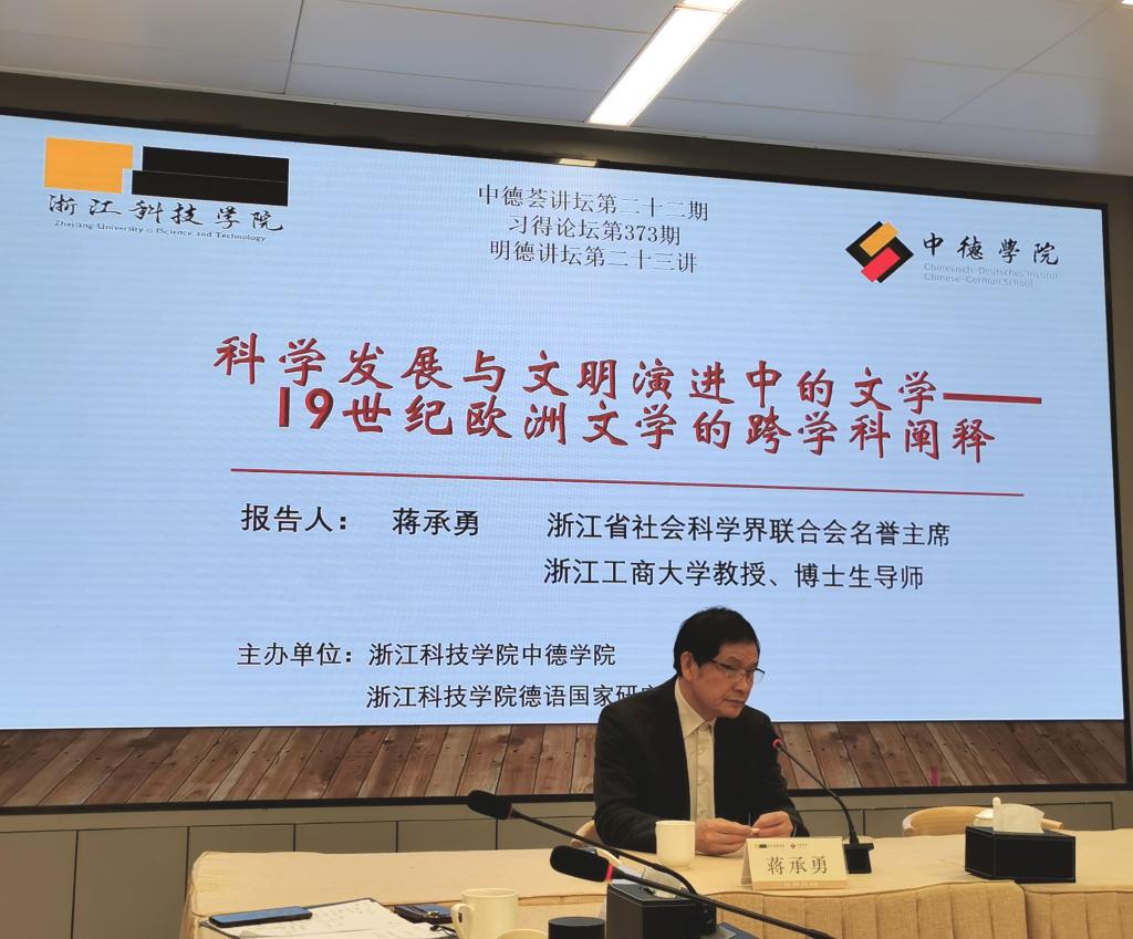 2023年11月24日,由浙江科技日本三级片日本三级片 和德语国家研究中心主办的 “中德荟”讲坛第二十二期学术报告在学校师生服务中心会议室举行。本次报告题为“科学发展与文明演进中的文学——19世纪欧洲文学的跨学科阐释”,由浙江工商大学文科资深教授、浙江省“特级专家”和“功勋教师”蒋承勇主讲,日本三级片 院长韩晓亚主持。德语国家研究中心主任徐理勤、科研处处长马伟锋以及日本三级片 、人文日本三级片和德语国家研究中心的老师们现场聆听了本场学术报告,反响热烈。
