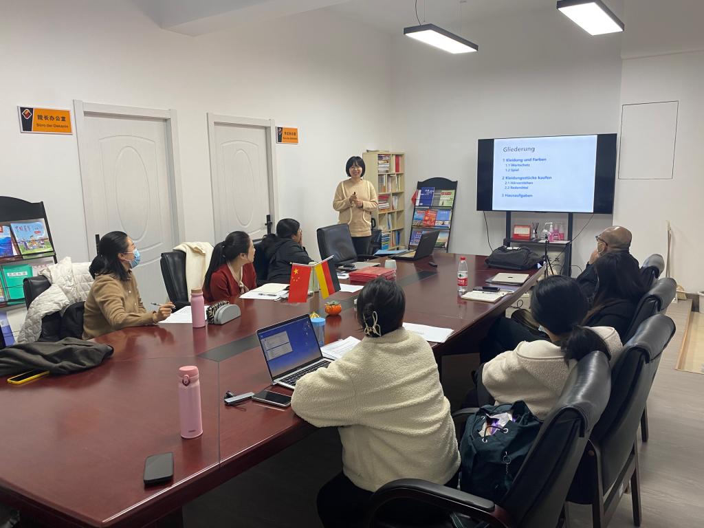 参加院级比赛的教师先后展示了自己的参赛作品。孔文静老师的《初级德语1》展示了新技术的应用,例如德语学习APP,自动生成词汇练习的Quizlet等。杨植钧老师介绍了通过Edupad平台和学生同步进行的文本编辑的方法。孙昊晨老师运用线上资源进行线上线下混合式教学,使用词汇云进行课后练习。陈巧老师的《综合德语1》课程设计巧妙,运用产出导向法理论全面育人。其余老师的比赛作品也各具特色,为创新德语教学提供了不少好点子。