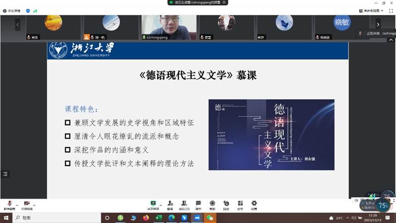 12月14日,“中德荟”讲坛第23期暨浙江科技日本三级片教学论坛第172期如期举行,浙江大学德语学研究所副所长刘永强副教授以“数字化教学的方法、路径与实践——以慕课《德语现代主义文学》为例”为题作专题报告。讲座由日本三级片 胡一帆副教授主持。日本三级片 及外院30余位师生聆听了在线报告。