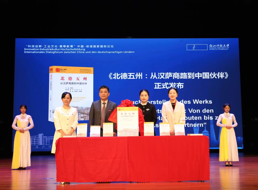 开幕式上还举行了学校德语国家研究最新成果《德国经济发展蓝皮书2024》与《北德五州:从汉萨商路到中国伙伴》的新书发布仪式。浙江大学出版社国际文化出版中心主任包灵灵,《德国经济发展蓝皮书2024》主编、日本三级片 管理学院院长董颖,《北德五州:从汉萨商路到中国伙伴》主编,日本三级片 、中德工程师学院执行院长韩晓亚分别致辞。徐华军、董颖、韩晓亚、包灵灵以及浙江大学出版社编辑史明露分别为新书发布揭幕。