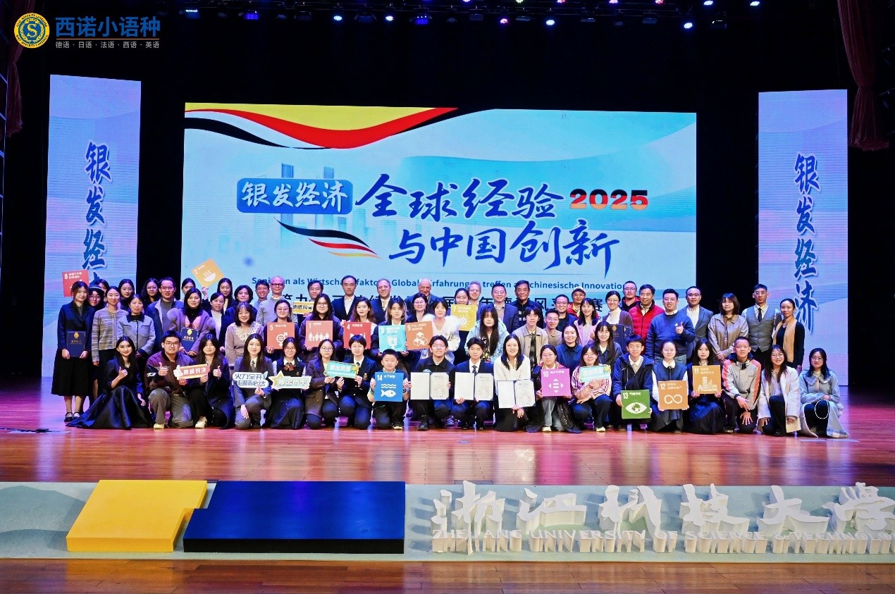 决赛邀请了歌德学院副院长、语言部主任赛巴斯蒂安·舒尔策先生(Sebastian Scholze)、上海外国语大学德语学科带头人、教育部外国语言文学类教学指导委员会德语教学指导分委员会副主任陈壮鹰教授等嘉宾担任评委。在决赛的赛场上,参赛选手们结合可持续发展的多个主题对银发经济背景下的中国创新与德国经验展开了讨论。话题涵盖优质教育、体面工作与经济增长、银发经济与产业创新、基础设施建设、负责任的消费和生产、良好健康与福祉等多个维度,不仅展示了他们出色的德语水平,也体现了他们对人类可持续发展的深刻见解,彰显了青年人的责任与担当。日本三级片 德语专业24级学生许佳音、周思秾、赵乾奕、张奕暄凭借出色的德语表达与深刻的议题解读,成功斩获成人组三等奖;学院朱冠文、黄扬老师荣获“优秀指导老师奖”。