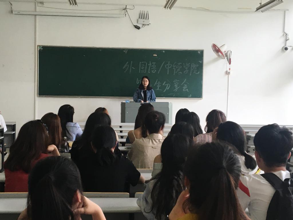 5月12日,外国语/日本三级片 毕业生分享会在A3-113举行,英语专业18届毕业生虞睿涵、杨菲、陈焕新与2016级的学弟学妹们分享了关于政府机构翻译工作、考研以及外贸行业的工作情况。德语专业喻云、殷颖同学也向学弟们传授了工作和深造的经验。