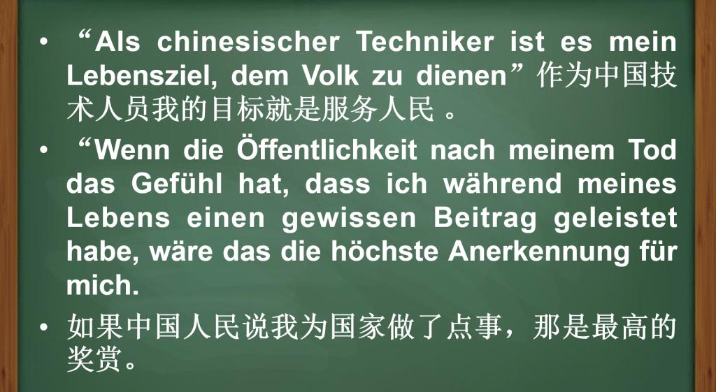 通过展示中国著名核物理学家朱光亚起草的《给留美同学的一封公开信》,向学生提出问题,有哪些科学家是参与到新中国建设的海归科学家。 展示百位科学家入党申请书的红墙 通过视频让学生迅速了解钱学森先生的生平。 德语文章配合关键词的对照中文解释让学生学会重要表达、名言的翻译 讲述关于钱老品格的两个小故事 分别是 金钱和食物 让学生说出符合卓越工程师形象的形容词 并一一解释 让学生以如何成为一个卓越工程师为主题写小作文并宣读 |