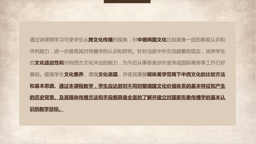通过该课程学习可使学生从跨文化传播的视角,对中德两国文化比较具备一定的客观认识和评判能力,进一步提高其对传播学的认识和研究。针对当前中外交流频繁的现实,培养学生的文化适应性和对待西方文化冲击的能力,为今后从事各类涉外宣传或商务等工作打好基础。提高学生文化素养、增强文化底蕴,并使其掌握媒体美学范畴下中西文化的比较方法和基本思路。通过本课程教学,学生应达到对不同时期德国文化价值体系的基本特征和产生的历史背景、及其媒体传播方法和手段都具备全面的了解并建立对国家形象传播学的基本认识的教学目标。