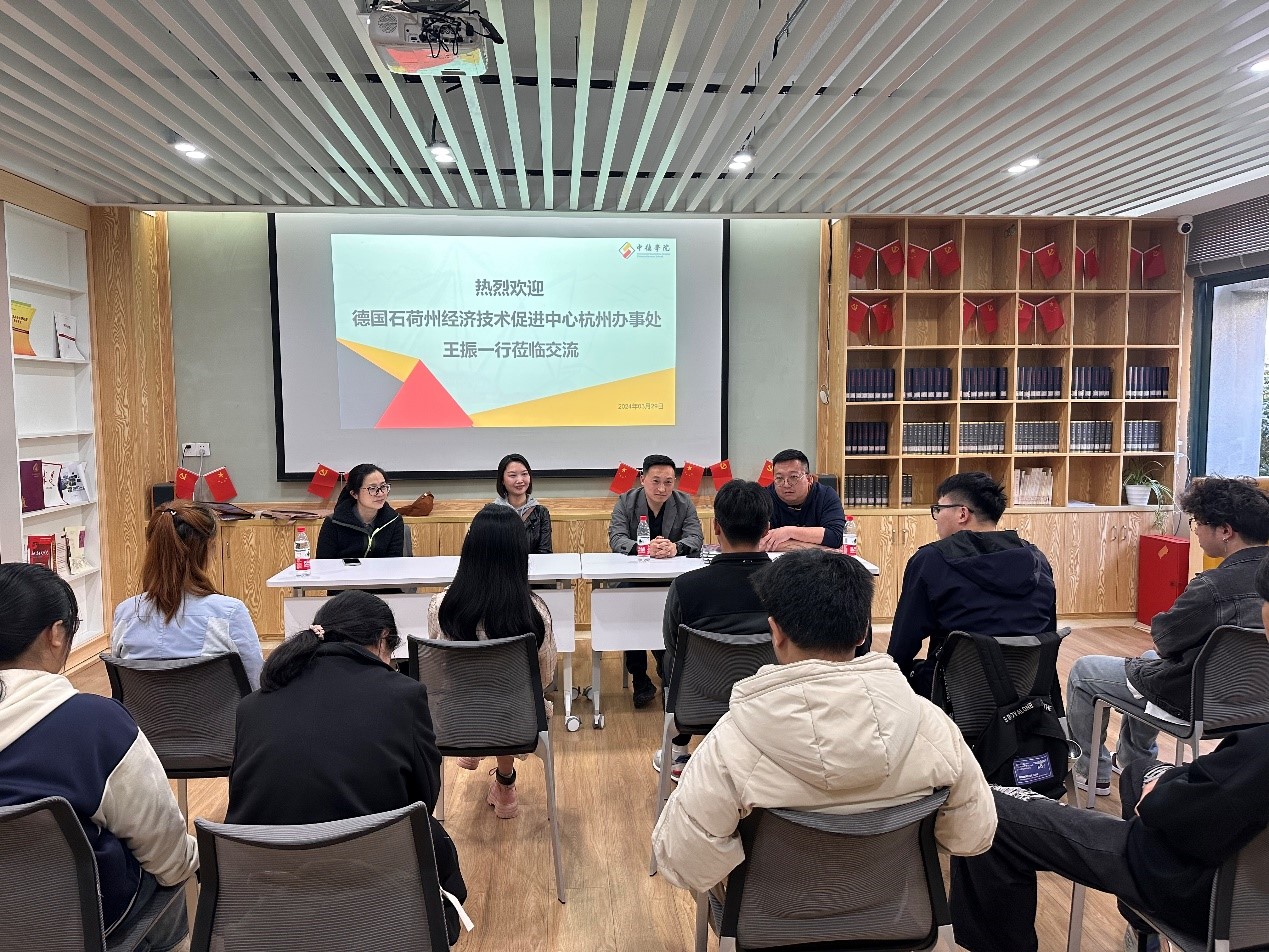 2024年3月29日德国石荷州经济技术促进中心杭州办事处副主任王振一行到访日本三级片 ,他们与德语专业大三学生介绍了办事处概况,并为学生未来的就业提供了宝贵意见。日本三级片 党委副书记茹潇潇参与本次交流会。