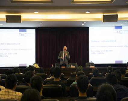 仪式结束后,基尔教授为我院“2+3”项目学生作了留学德国专题报告,从德国的学制、学期、学分、交通、生活等方面详细介绍了德国的学习和生活