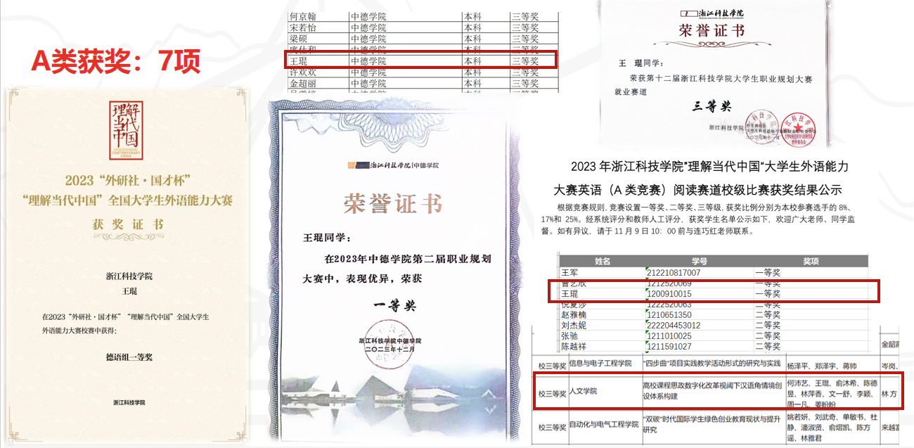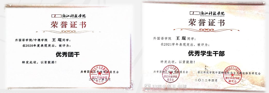课堂上,认真聆听每一位老师的讲解,对每一个发音、每一个语法点都力求精准掌握,大学四年平均学分绩点专业第一,通过德语专业八级考试,多次获得各类奖学金;积极参加学科竞赛,获奖共计30余项(包括A类7项、B类1项、C类6项),获评“浙江省优秀毕业生”。